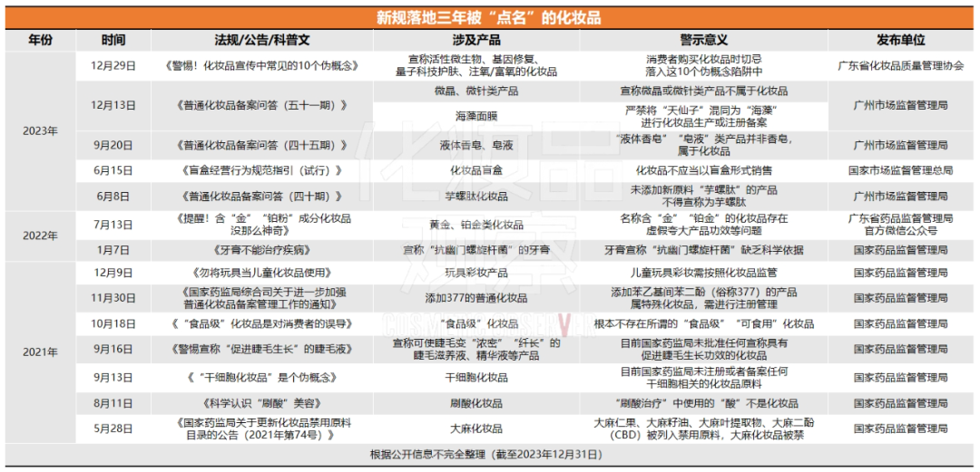 2023年事末,广东省药监局直属化妆品协会官宣平台“广东省化妆品质量治理协会”发布科普文《警惕!化妆品宣传中常见的10个伪观点》,再次重申药妆、干细胞、EGF(表皮生长因子)、黄金美容、械字号面膜/医美面膜、食物级化妆品为“伪观点”,并初次将活性微生物、基因修复、量子科技护肤、注氧/富氧4类传播鼓吹列入“黑名单”,明确标签含有上述10类传播鼓吹的化妆品属在背法产物。