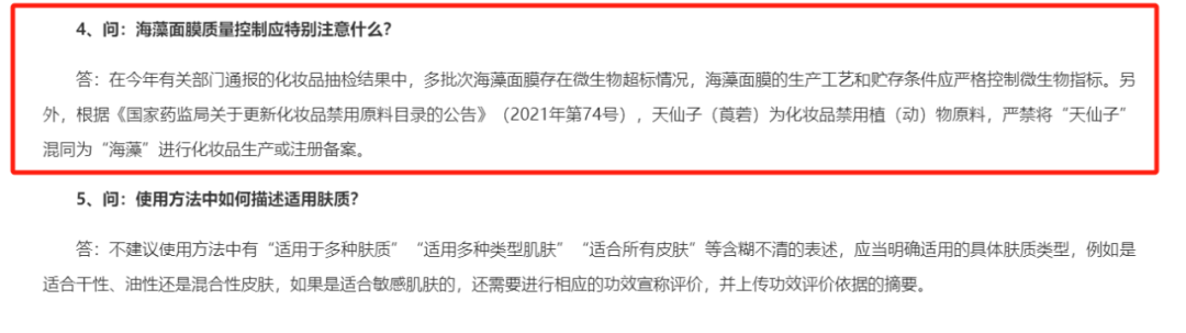 2023年,芋螺肽化妆品及海藻面膜接连被官方“点名”。广州市监局于《大众化妆品存案问答(四十期)》中指出,“芋螺肽”是维琪科技在2023年存案的化妆品新原料,未添加该新原料罢了存案传播鼓吹“芋螺肽”的化妆品,需尽快修改相干传播鼓吹;《大众化妆品存案问答(五十一期)》指出,于已往一年的官方抽检及行政惩罚中,海藻面膜屡次因微生物超标榜上有名,而祸首罪魁是添加了禁用原料“天仙子”,“严禁将‘天仙子’混同为‘海藻’举行化妆品出产或者注册存案”。