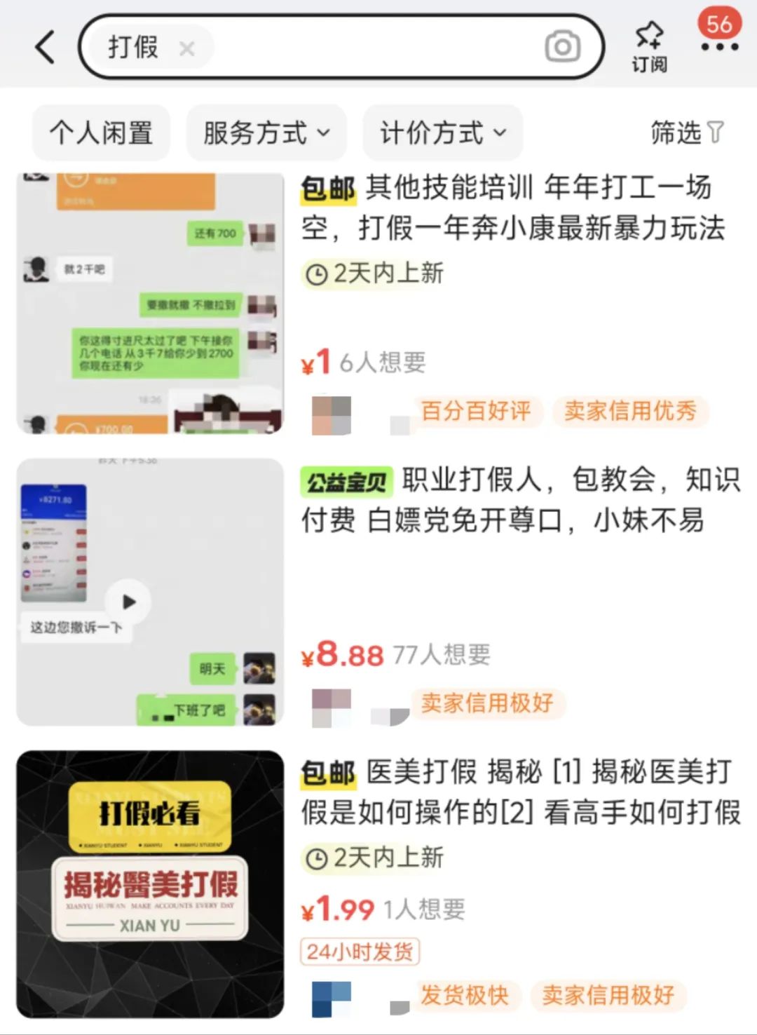 青眼查询拜访发明,职业打假人不仅对于化妆品有特定的存眷点,甚至还有形成为了一条教培财产链。于知名二手生意业务平台闲鱼,青眼以“打假”为要害词搜刮,弹出了不少“打假技术培训课程”,有卖家甚至传播鼓吹“年年打工一场空,打假一年奔小康”。