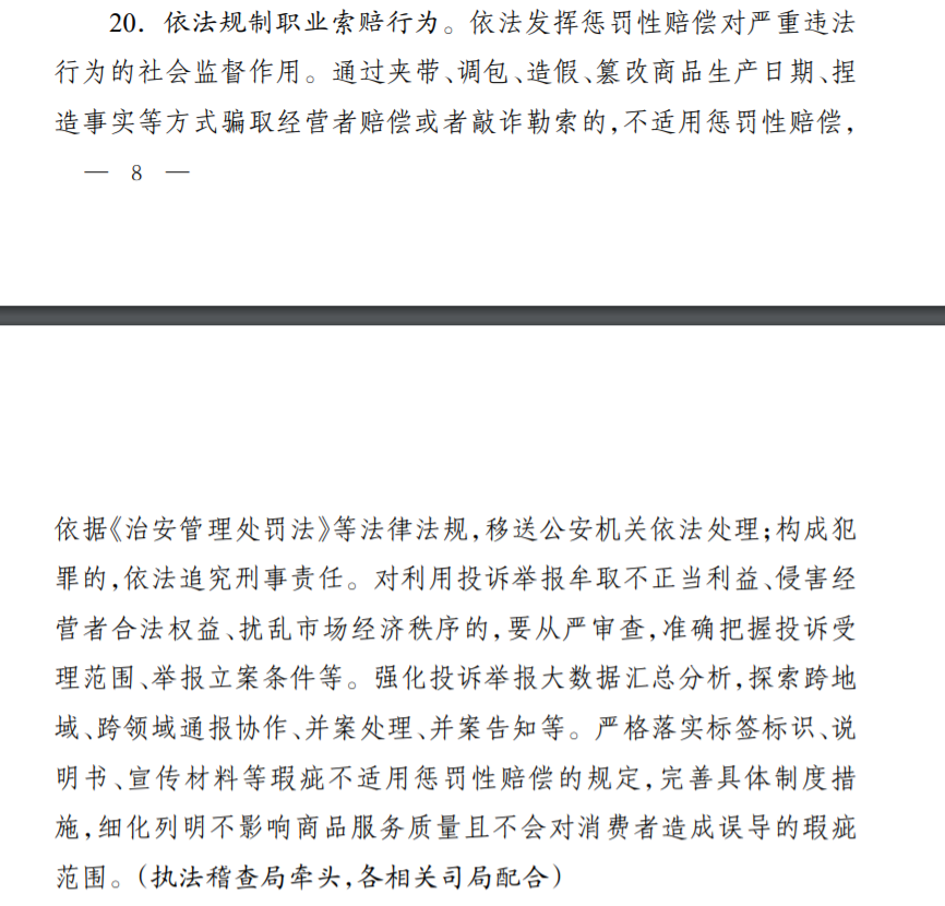 与此同时,国度市场监视局还有初次明确依法例制职业索赔举动。9月3日,市场羁系总局出台了《市场羁系部分优化营商情况重点举措(2024年版)》(下称《重点举措》)。《庞大举措》明确暗示,经由过程夹带、调包、造假、窜改商品出产日期、假造事实等方式骗取谋划者补偿或者者欺诈打单的,不合用处罚性补偿,依据《治安治理惩罚法》等法令法例,移送公安机关依法处置惩罚;组成犯法的,依法究查刑事责任。对于使用投诉举报攫取不合法好处、损害谋划者正当权益、侵扰市场经济秩序的,要从严审查。