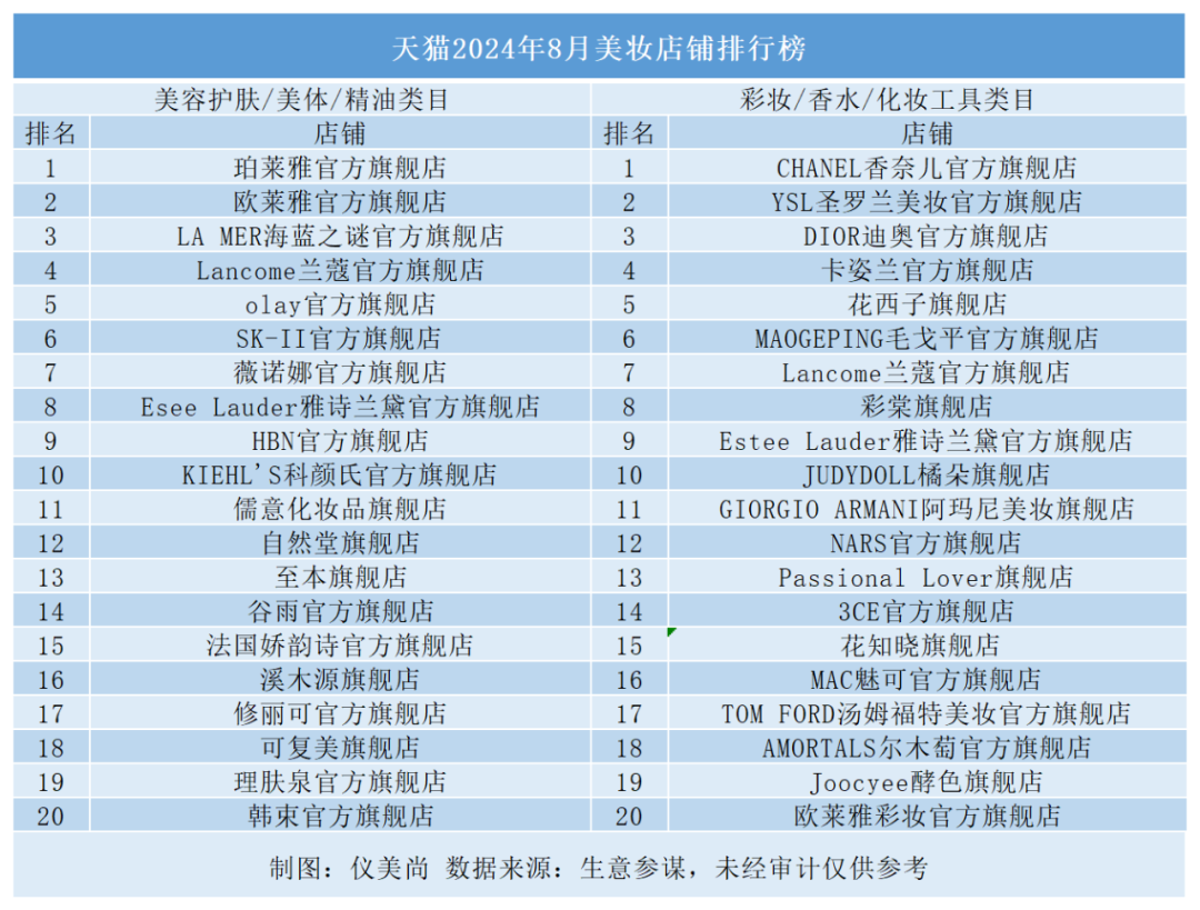 TOP20店肆中,国货色牌及国际品牌等分秋色,均有10家品牌入围。不外,国际品牌排名上升较着——除了欧莱雅的排名与7月持平,其余9个国际品牌排名均呈上升之势。此中,雅诗兰黛上升7名,SK-II上升6名,娇韵诗及海蓝之谜均上升4名。