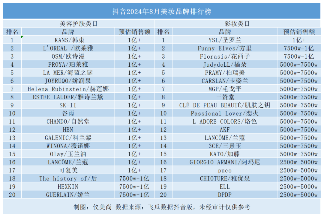 仪美尚按照飞瓜数据抖音版,梳理出抖音8月份TOP20的美容护肤类目品牌及彩妆类目品牌。