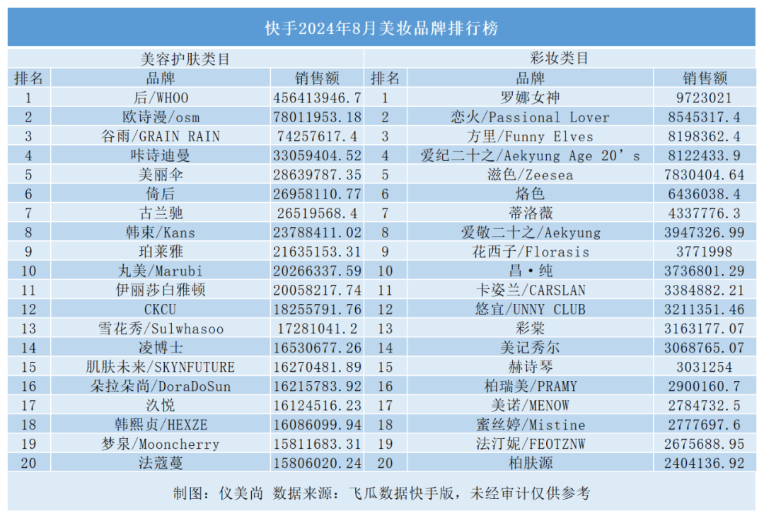 快手:美容护肤TOP20环比增加91.6%,后/Whoo月销近5亿霸榜第一快手平台,美妆市场于8月份也显示出强烈的“复苏”之势。