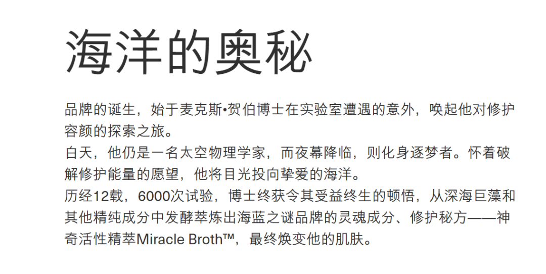 典型例如海蓝之谜,作为主打修护的品牌,其开创故事曾经作为品牌流传重点:太空物理学家于试验变乱中被严峻灼伤,然后发现这款面霜实现修护,此中最焦点的身分“神奇活性精粹”中含有深海巨藻提取物,于低温发酵历程中更是履历了播放古典音乐等“形而上学操作”,终极创造出了独家秘方。