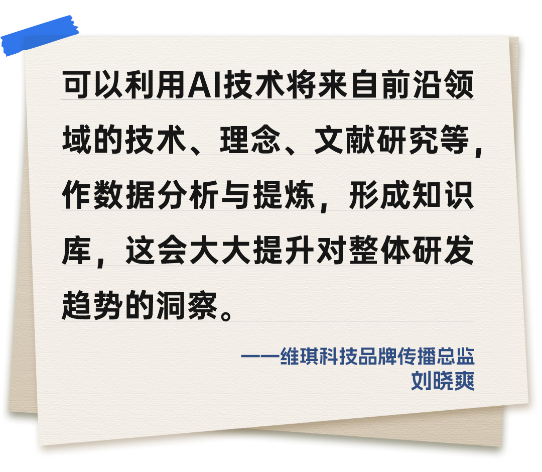刘晓爽暗示,“可以使用AI技能未来自前沿范畴的技能、理念、文献研究等,作数据阐发与提炼,形成常识库,这会年夜年夜晋升对于总体研发趋向的洞察。”
