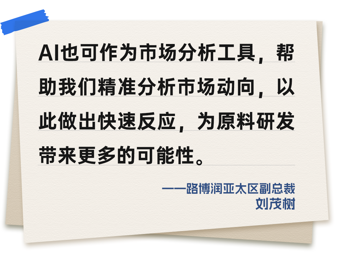 除了此以外,AI技能还有连续向市场动向阐发、皮肤检测技能等运用场景渗入,为原料研发赋能。“AI也可作为市场阐发东西,帮忙咱们精准阐发市场动向,以此做出快速反映,为原料研发带来更多的可能性。”路博润亚太区副总裁刘茂树说道。