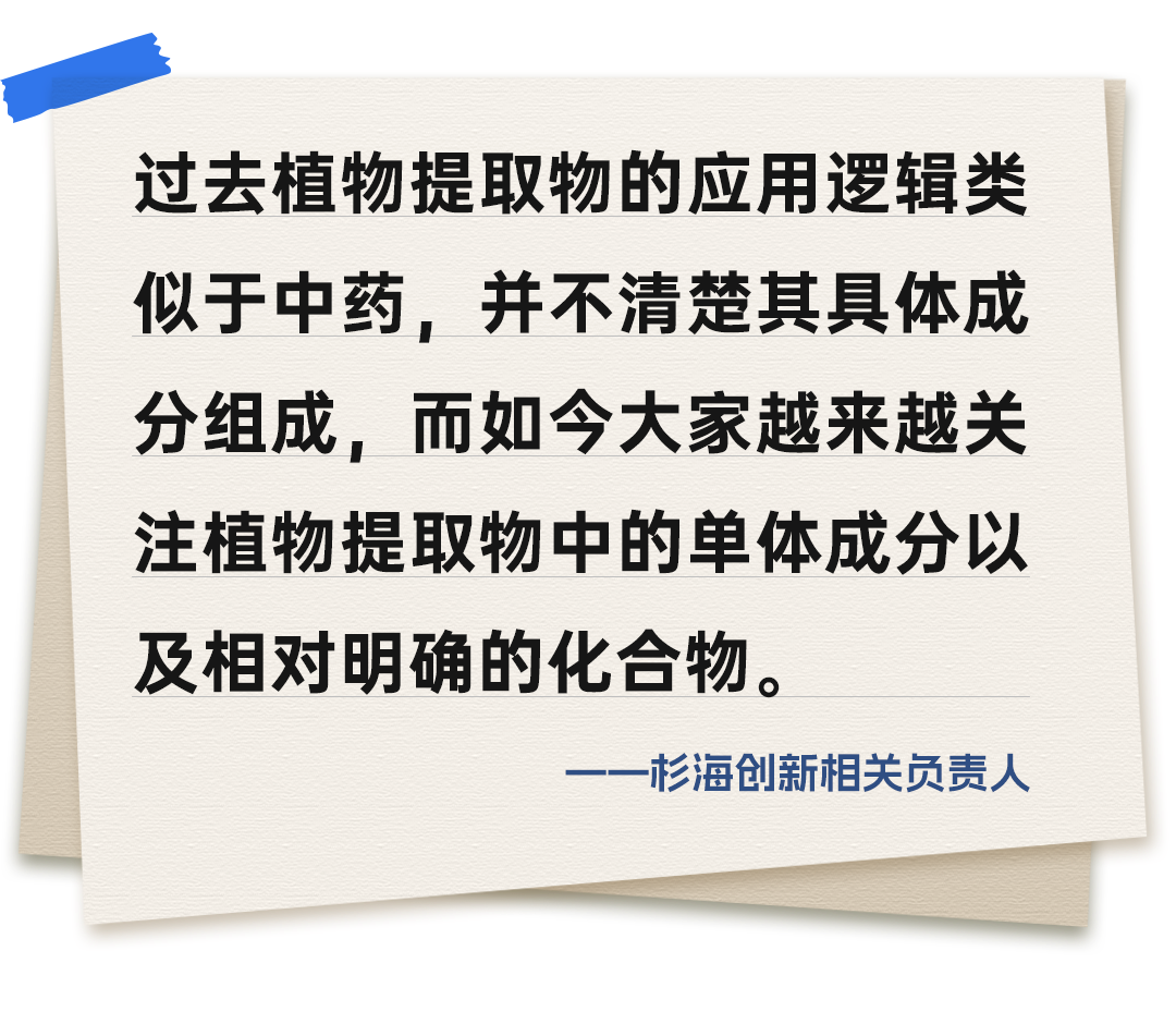 杉海立异相干卖力人指出,已往植物提取物的运用逻辑近似在中药,人们往往其实不清晰其详细身分构成,只要终极有用就行。然而,跟着行业的成长、法例的完美及消费者认知的晋升,如今各人愈来愈存眷植物提取物中的单体身分以和相对于明确的化合物,这也促使企业于研发及出产历程中越发看重身分的明确性及精准性。