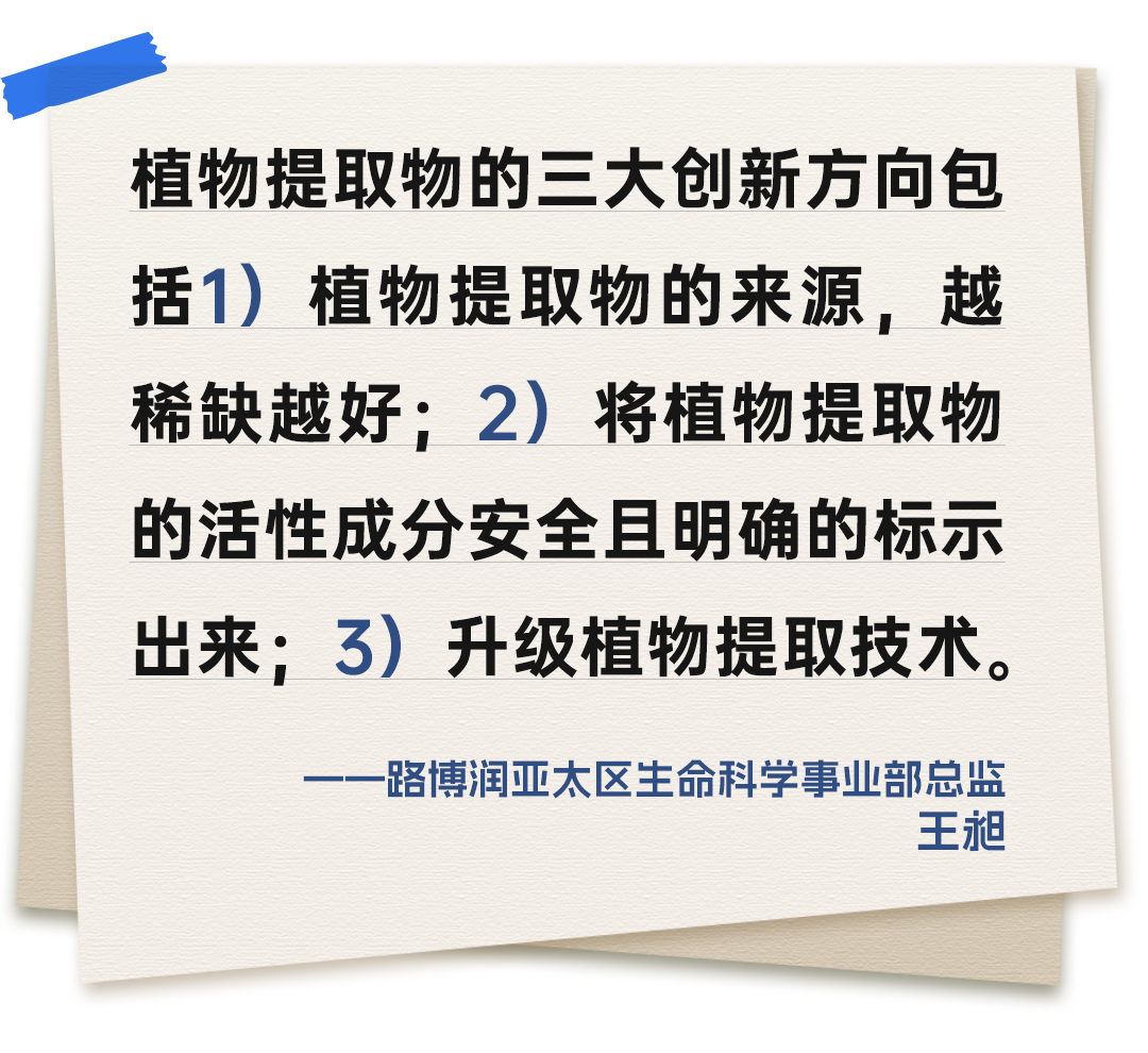 此外,于路博润《小我私家照顾护士市场白皮书》发布会上,王昶则指出了植物提取物的三年夜立异标的目的:1)植物提取物的来历,越稀缺越好;2)将植物提取物的活性身分安全且明确的标示出来;3)进级植物提取技能。
