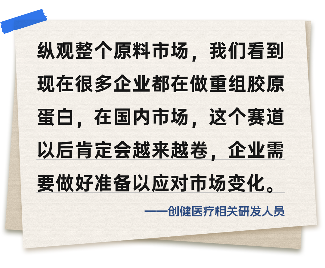 “纵不雅整个原料市场,咱们看到此刻许多企业都于做重组胶原卵白,于海内市场,这个赛道之后必定会愈来愈卷,企业需要做好预备以应答市场变化。”创健医疗的相干研发职员如是说道。