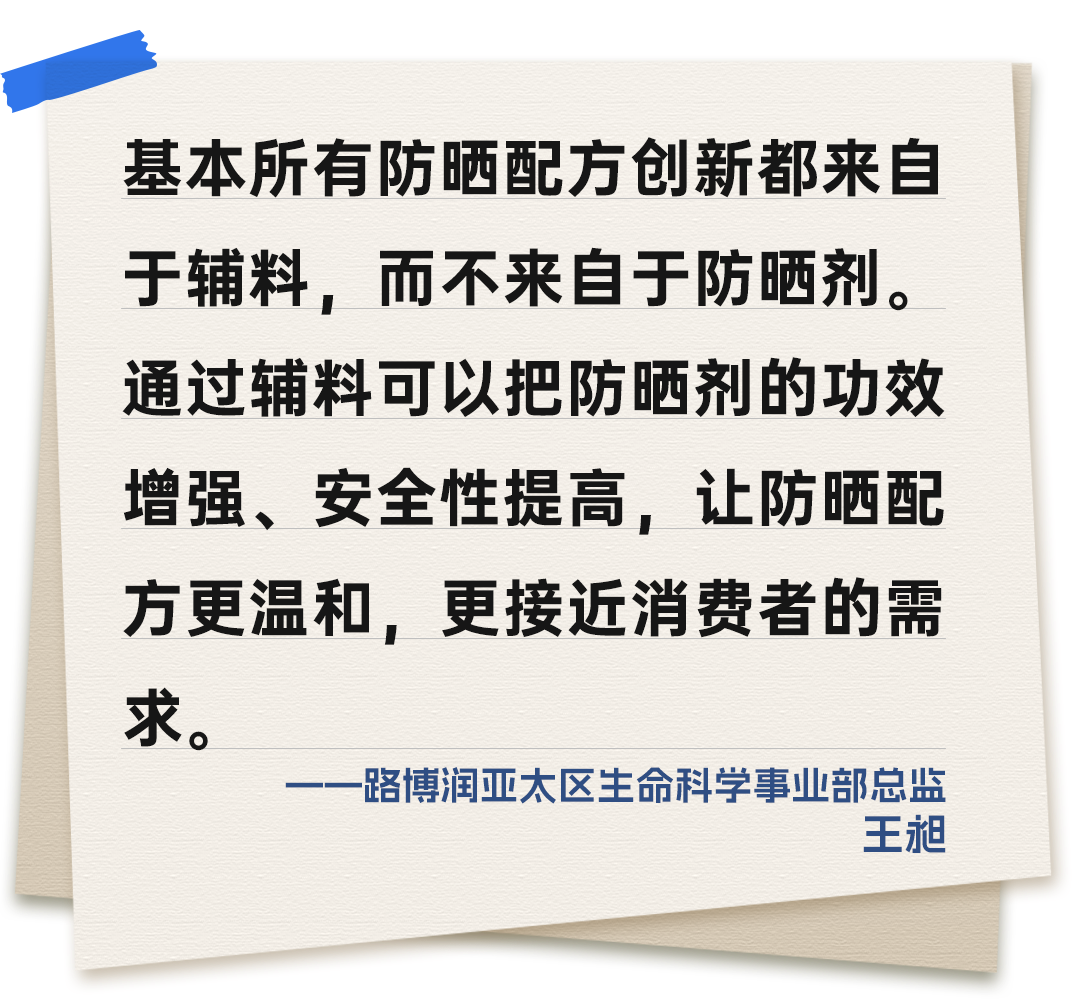 特别是,于防晒范畴,辅料的利用就很是遍及,它们于优化配方、晋升总体机能及用户体验方面阐扬着主要作用。“基本所有防晒配方立异都来自在辅料,而不来自在防晒剂,由于防晒剂法例相对于严酷,研发出一个新的防晒剂难度较年夜,而经由过程辅料则可以把防晒剂的功能加强、安全性提高,让防晒配方更暖和,更靠近消费者的需求。”王昶说道。