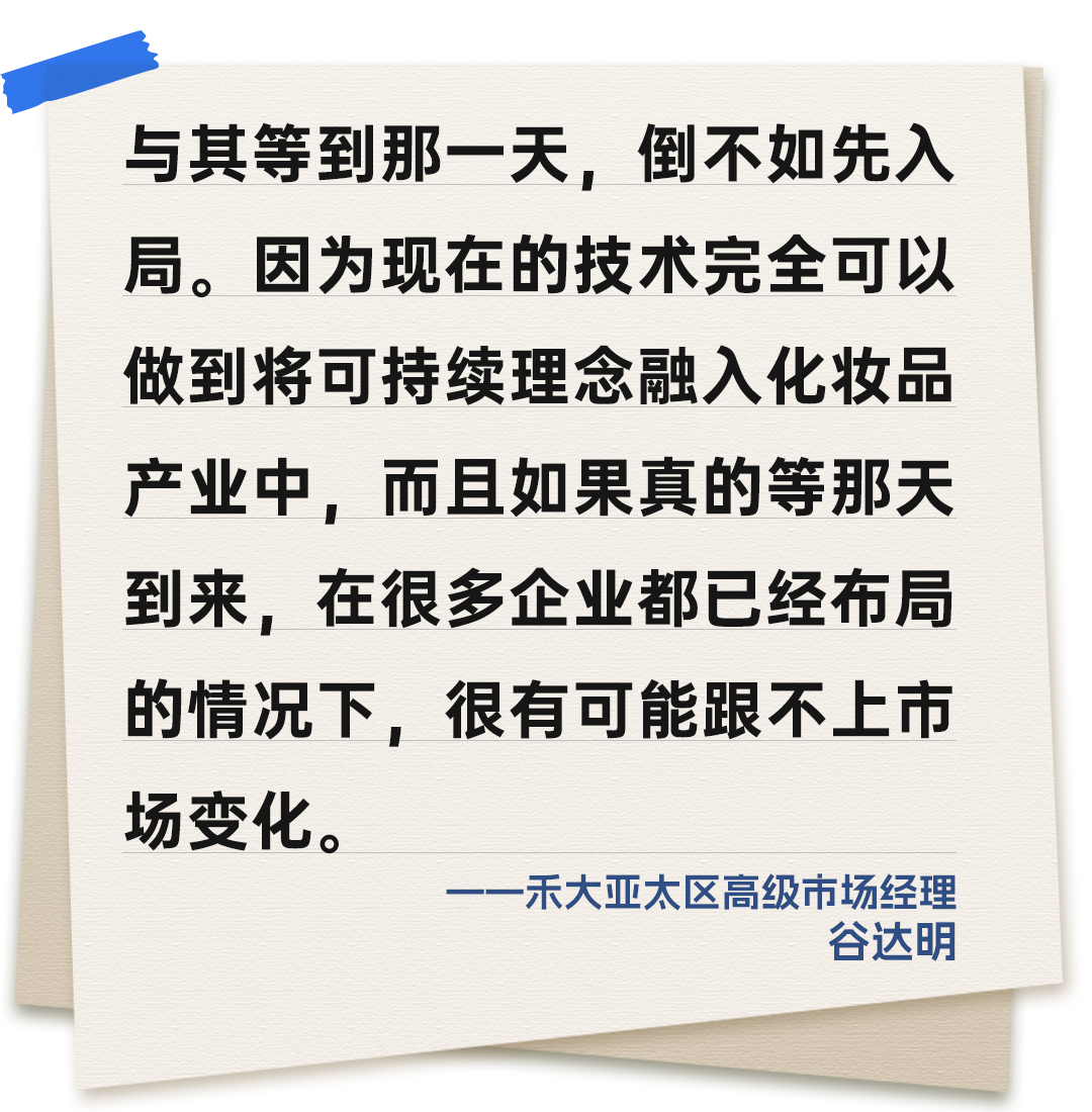 “可是,与其比及那一天,倒不如先入局。一方面,从技能上可行性上来看,此刻的技能是彻底可以做到将可连续理念融入化妆品财产中的;另外一方面,假如真的等那天到来,于许多企业都已经经结构的环境下,颇有可能跟不上市场变化。”
