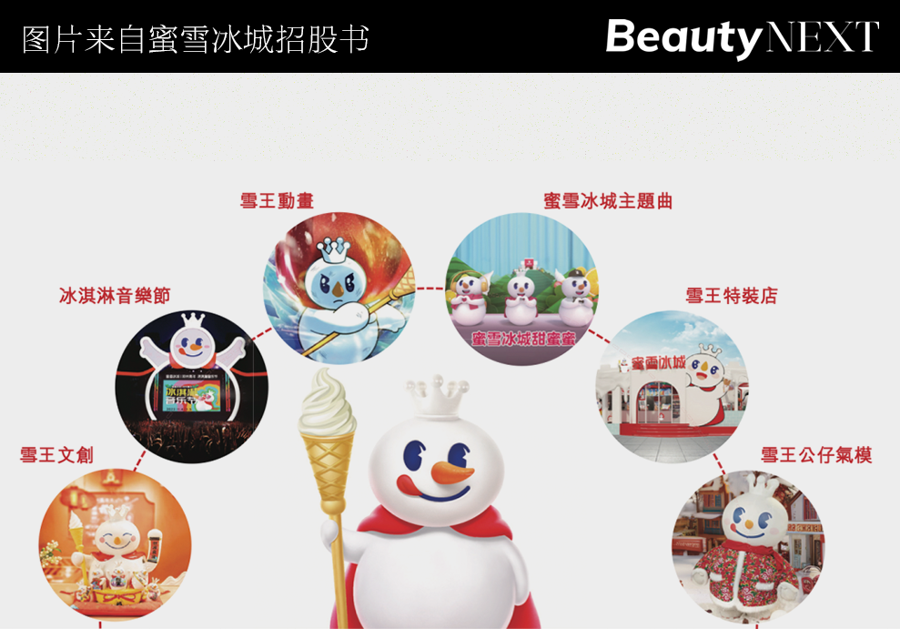 而蜜雪冰城的「雪王」,就是现阶段将吉利物这一营销手腕应用到极致的品牌。五年来,「雪王」形象险些被填充到品牌细节的各个方面,甚至呈现于品牌的招股书中。