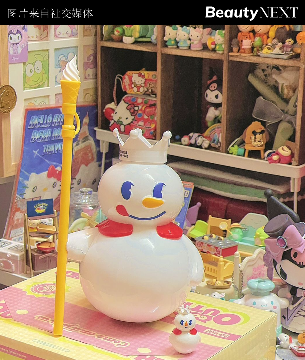 于谷子经济(指发卖二次元IP形象的周边产物)火热确当下,雪王的“谷子”早于2021年,就给品牌带来了现实收益。那年,“会唱歌的雪王”公仔B站发售,售价89元,限量2000只进场就售罄,二手市场行情一度涨到500元摆布。