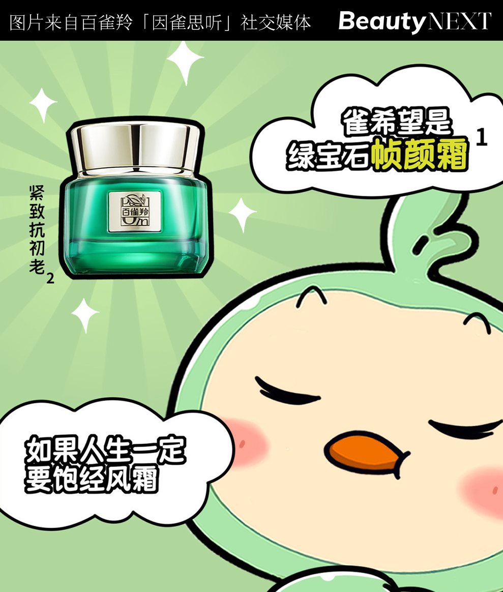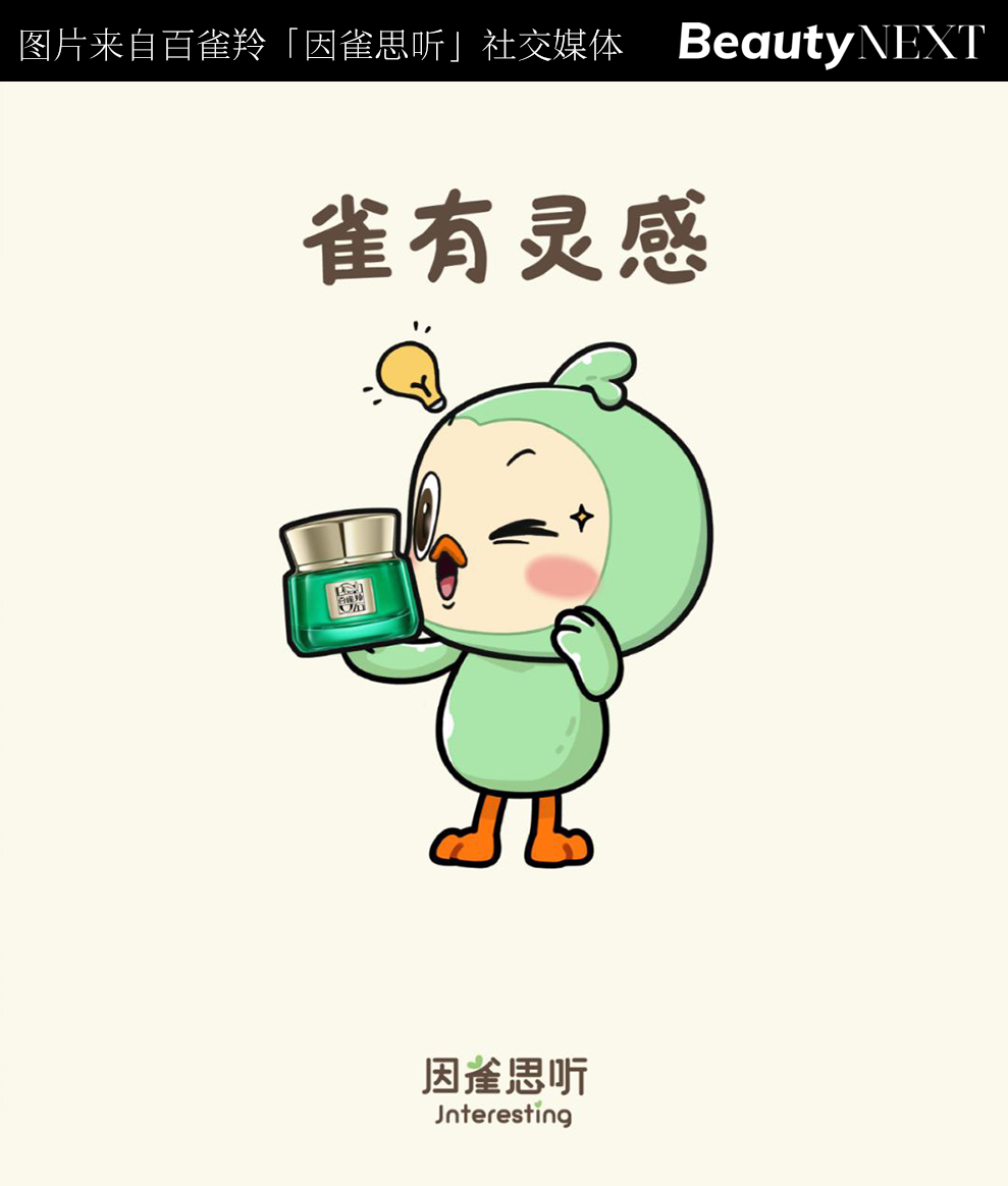 美妆范畴较为出圈的品牌吉利物应该是百雀羚的绿雀。早于2018年,百雀羚于及喜茶的联名中,设计出了“阿喜”及“阿雀”两个虚拟形象,来具象形容互助。以后,百雀羚沿用这一脚色,并将其成长成后面的「因雀思听」。
