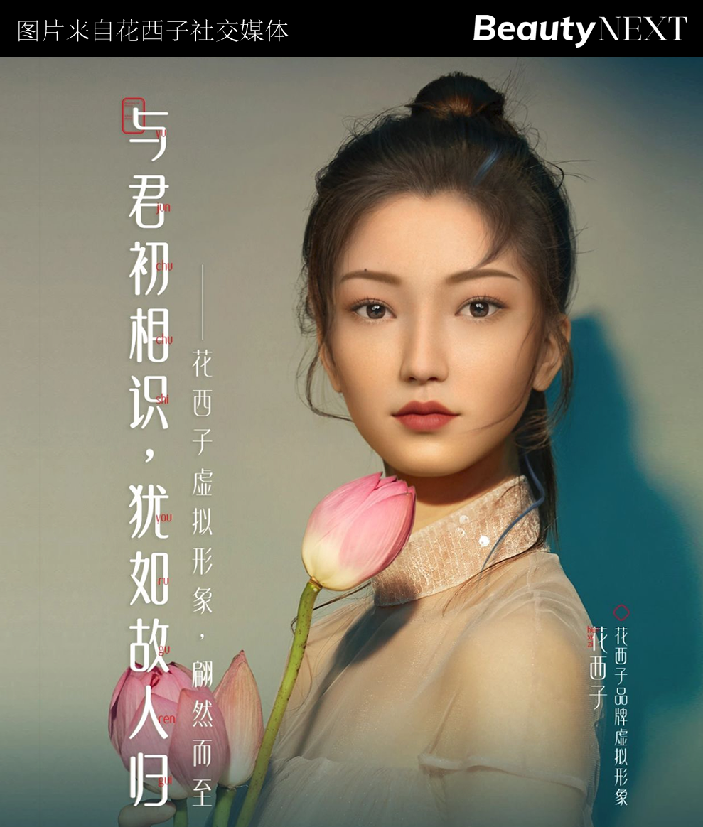 美妆品牌的“虚拟人”代言人,也曾经于元宇宙营销热潮中好景不常。例如,花西子曾经打造过一名古风美男形象的虚拟人,但这个虚拟人年夜多仅作为海报模彪炳现,并未与消费者实现真实的内容共创与深度互动。