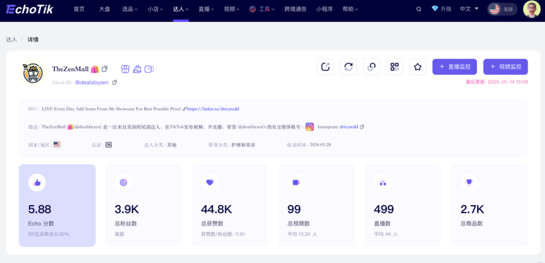 这些达人年夜多以视频带货为主,但排名第二位的TheZenMall以直播为重要带货方式,2024年5月28日被EchoTik收录至今(2025年1月14日),TheZenMall共开启了499场直播,但只发布了99条视频。