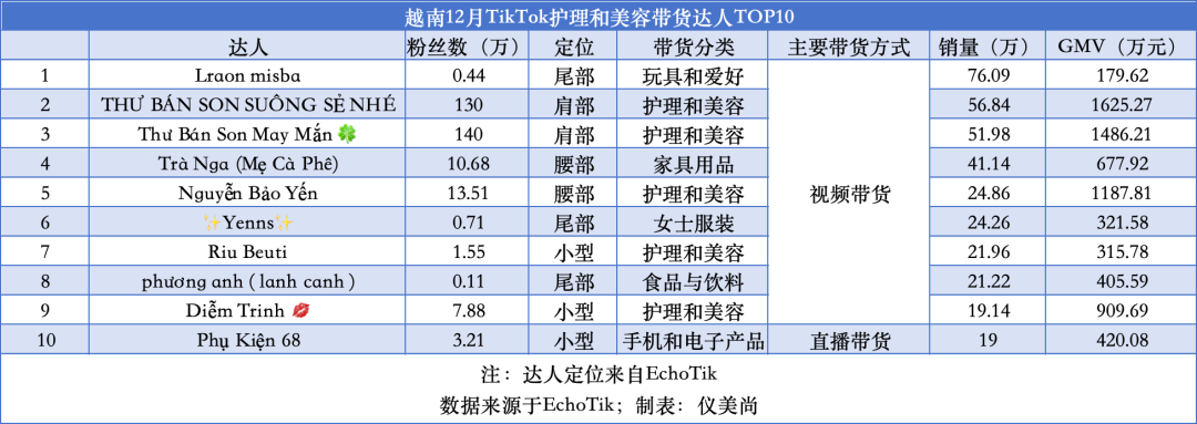 越南12月TikTok照顾护士及美容带货达人TOP榜中,除了了照顾护士及美容类达人,玩具及喜好、家具用品、女士服装、食物与饮料、手机及电子产物这五类产物带货达人也颇受存眷。