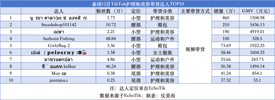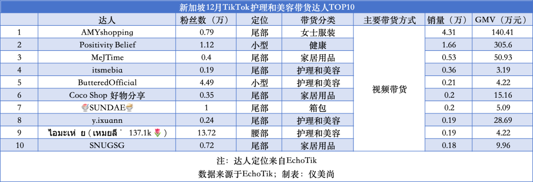 这10位达人中,粉丝量至多的是来自泰国的腰部达人(TikTok id:妹妹eilyx),堆集了13.72万粉丝。但于12月的新加照顾护士及美容市场上,其仅卖出0.19万件相干商品,GMV录患上4.22万元。