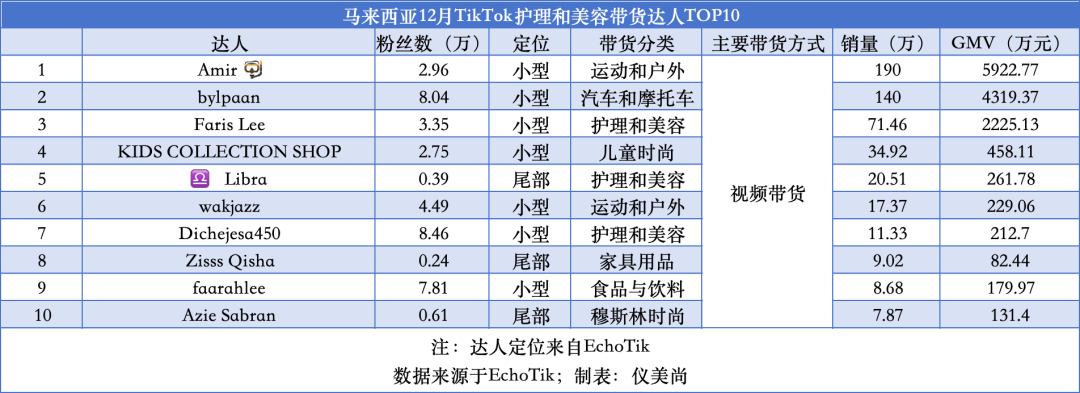 除了了小型达人,粉丝量于1万如下的尾部达人于马来西亚市场也颇具潜力,好比Libra,排名第5位,虽然仅有0.39万粉丝,但12月卖出了261.78万元的照顾护士及美容产物。