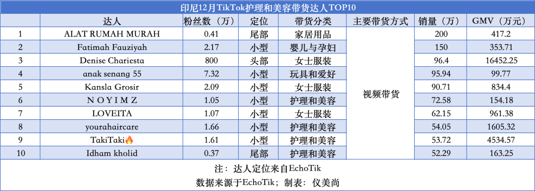 12月,印尼TikTok照顾护士及美容带货达人榜上,排名第三位的Denise Chariesta,于TikTok上已经有800万粉丝,是当月独一上榜的头部达人。Denise Chariesta带货分类为女士服装类,但其也卖出了96.4万件照顾护士及美容产物,并创下1.6亿元的发卖额,远超其他上榜达人。