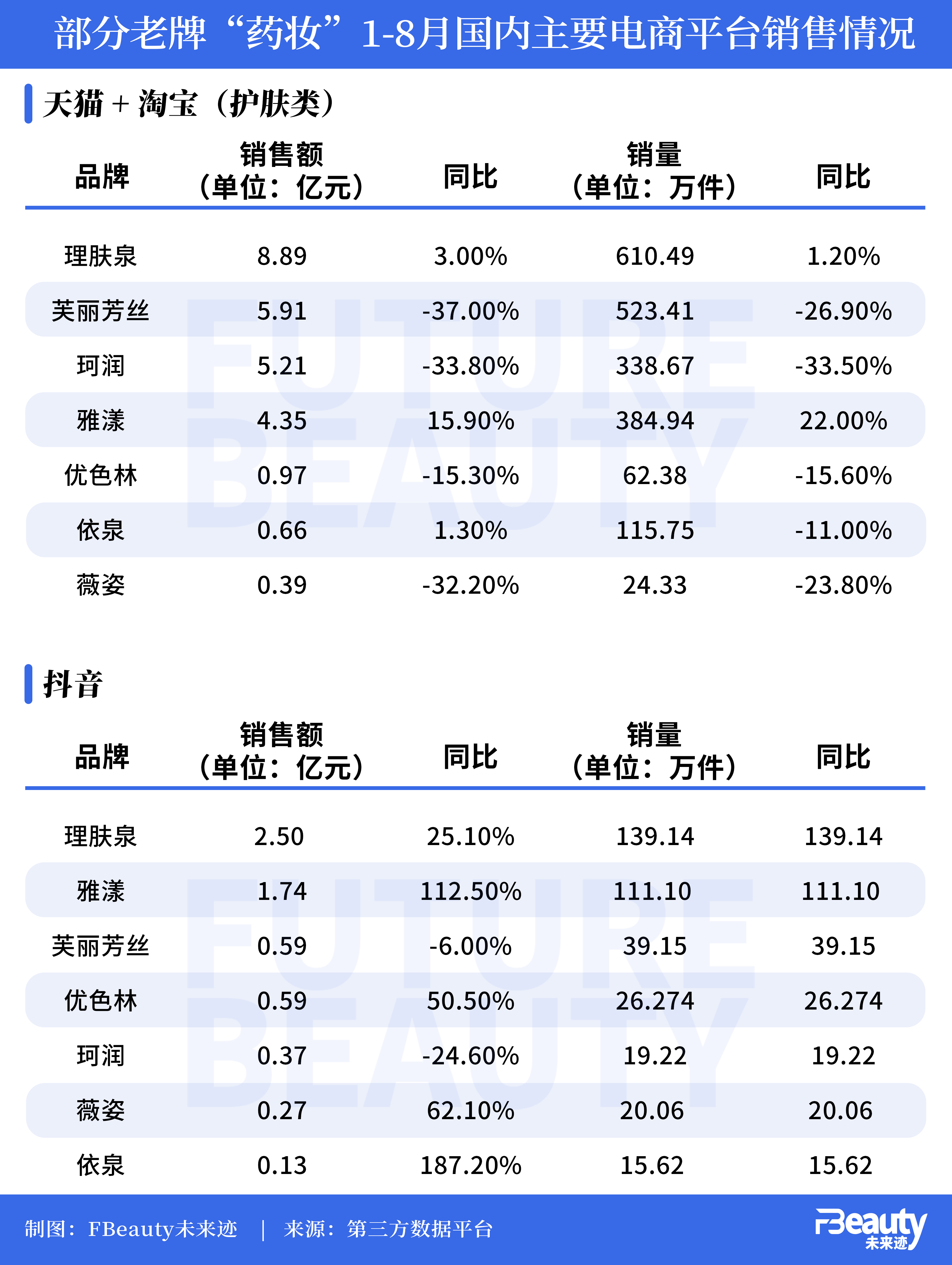差异化成长较着,哪些品牌乐成“转型”?《FBeauty将来迹》于第三方数据平台检索发明,于本年1-8月,理肤泉、芙丽芳丝、珂润、雅漾、优色林、依泉、薇姿这7个品牌于天猫+淘宝、抖音渠道共实现了32.57亿元的发卖额。